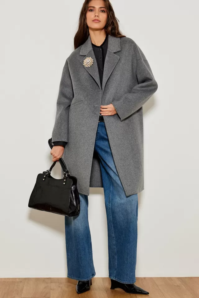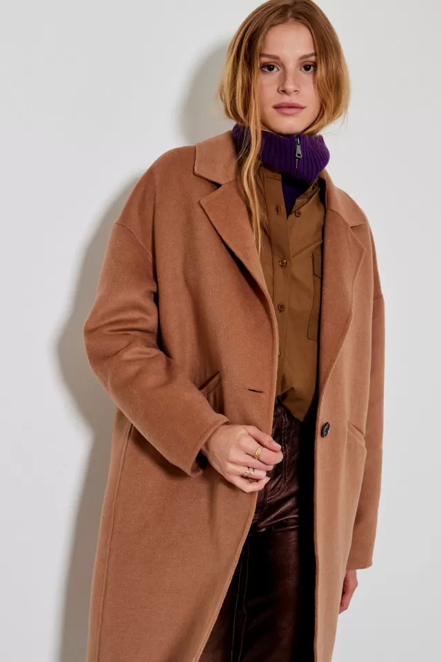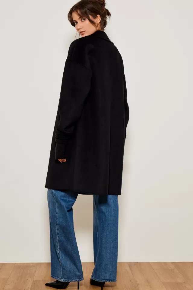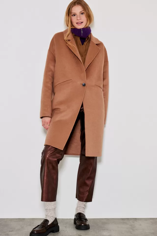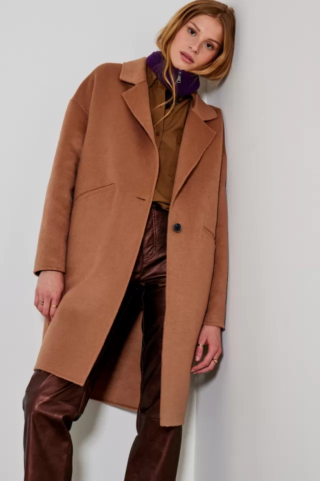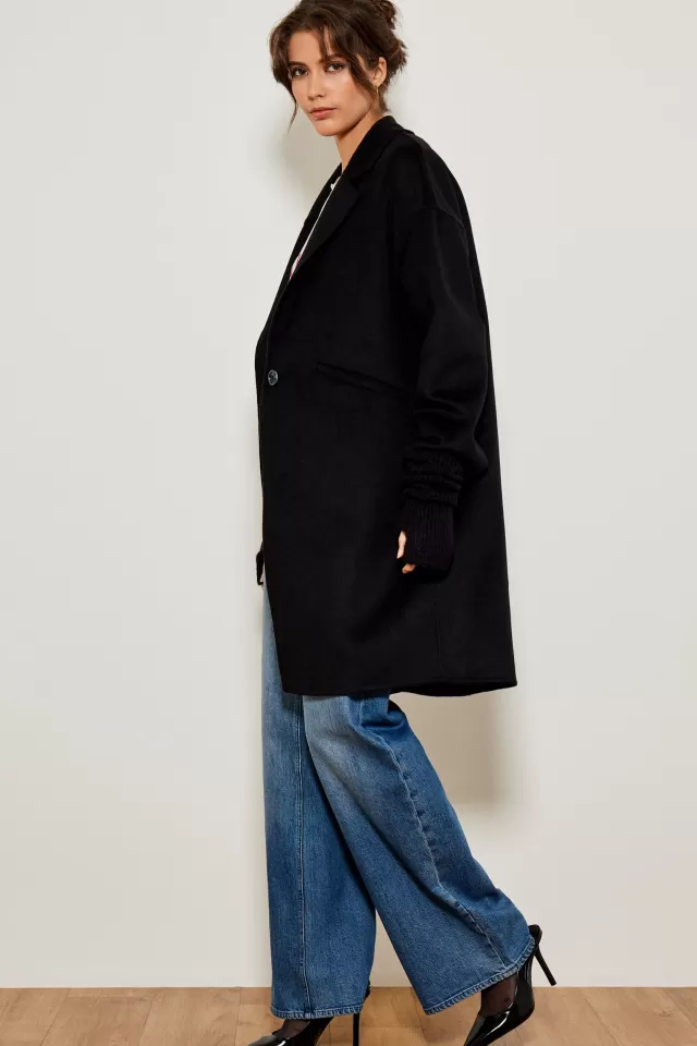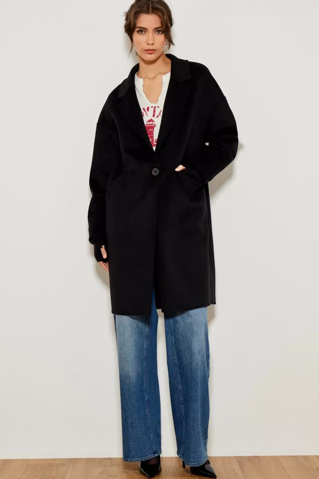Manteau longCoupe droiteFermeture avec un bouton2 poches sur le devantNotre mannequin porte une taille S.