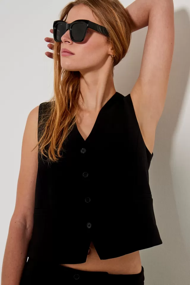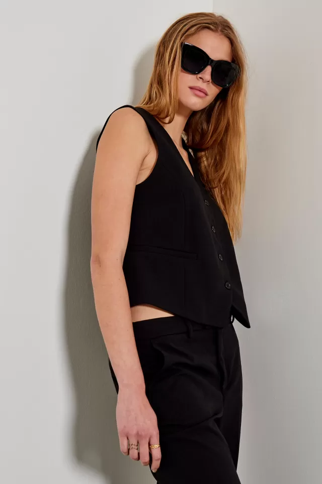 Gilet de costumeCoupe droiteFermeture à boutonSans manche2 poches sur le devantNotre mannequin porte une taille S.
