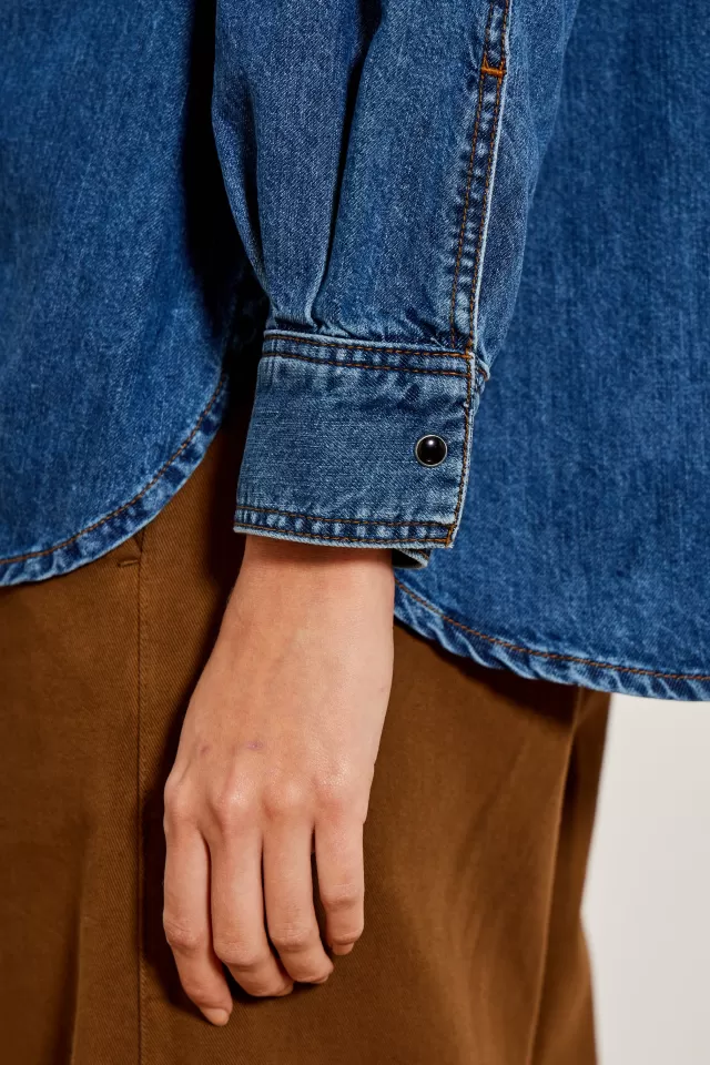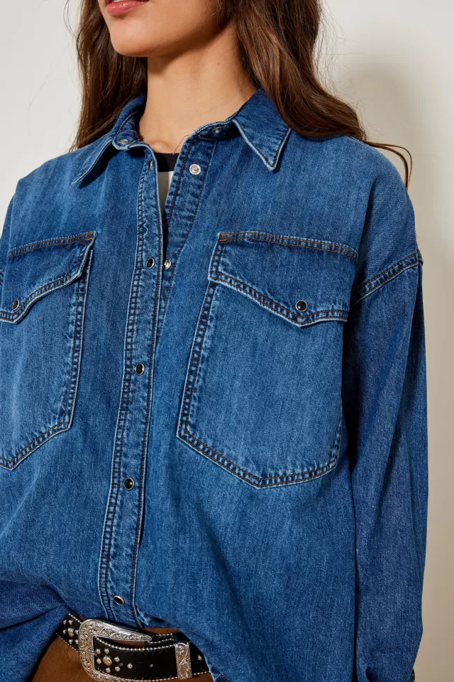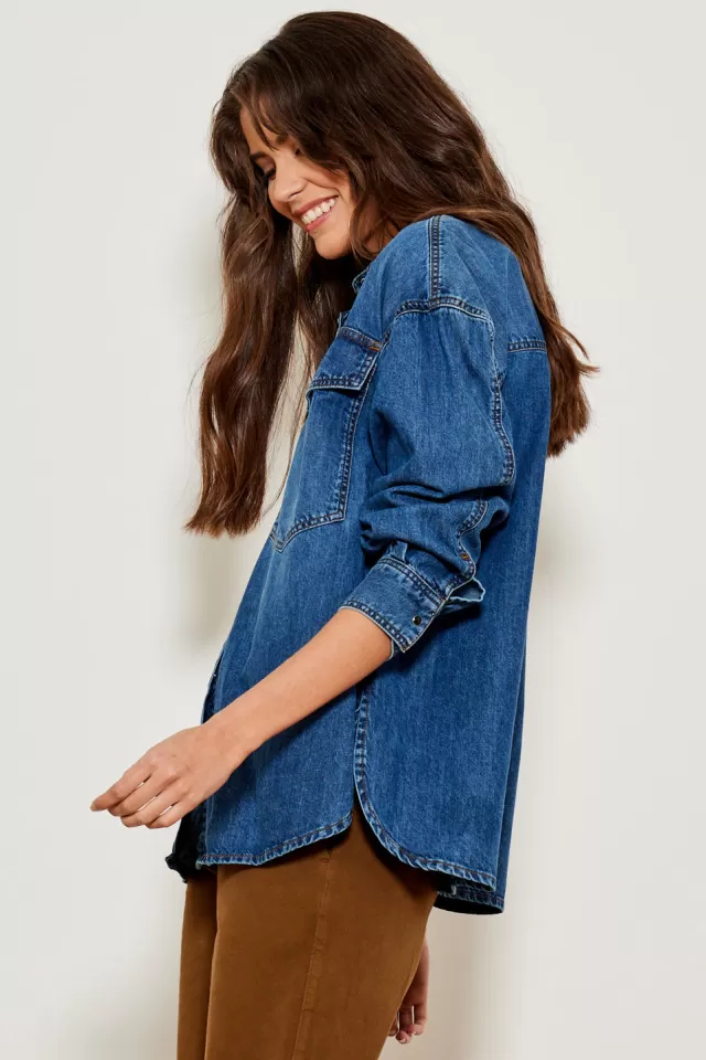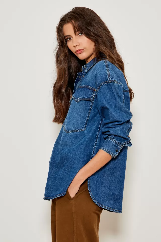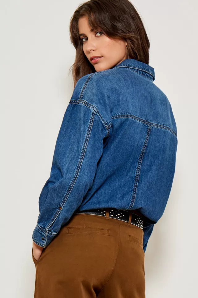 Denim shirt Oversized cut Closes with a placket on the front with buttons Free collar Long sleeves 2 pockets on the fro…